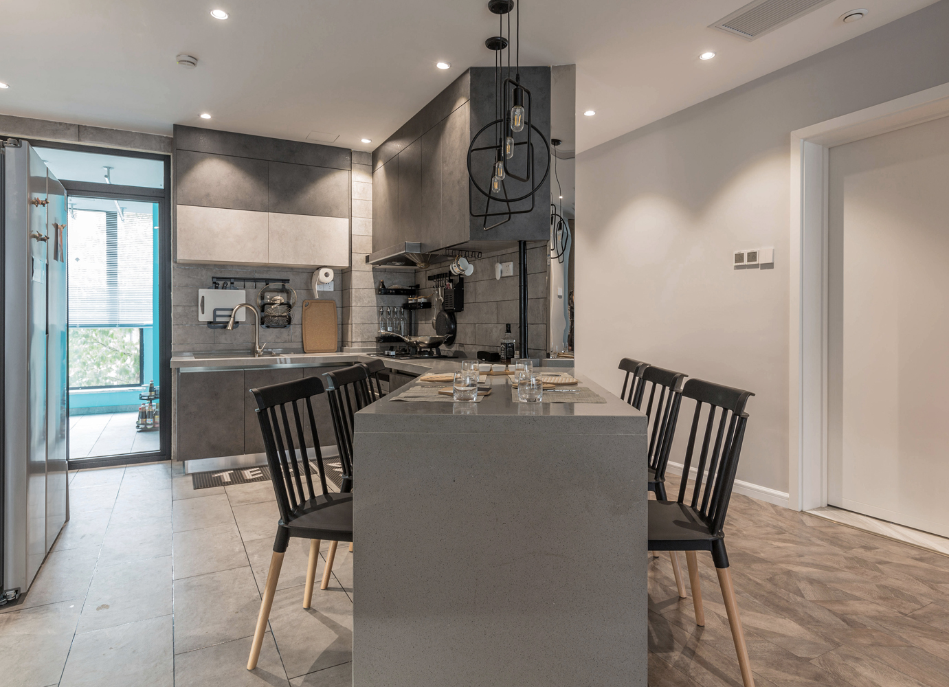 从这里我们可以看到这个户型也不是方正户型,所以这里在设计的时候也就有了一个很大胆的想法。就是在开放式厨房的边上设计一个斜式吧台,而这个吧台就可以充当餐桌,平时与家人就可以在这用餐了!而餐厨房的这个设计,俨然打造出了一个时尚的家居餐吧,让日常家庭用餐变得更有情调了呢~