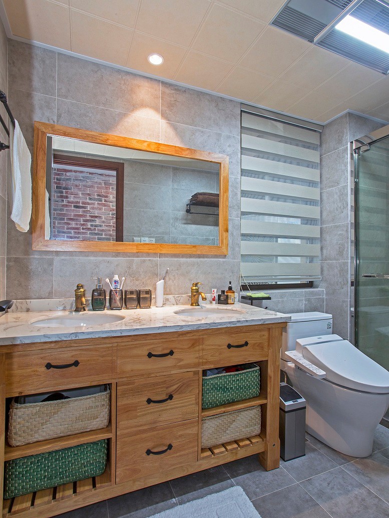 如果你的卫生间已经空间利用大化,但还有很多东西无处可放怎么办?其实可以参考厨房的收纳,把抽屉和橱柜中安装一些特殊的五金件,或柜子侧面的挂篮等,收纳只要做到合理有序,就能腾出大空间。除此之外,你还可以选择可移拉式的镜子,这样在镜子后面还可以安装一个柜子,里面放一些面部护理用品或剃须刀等常用物品。