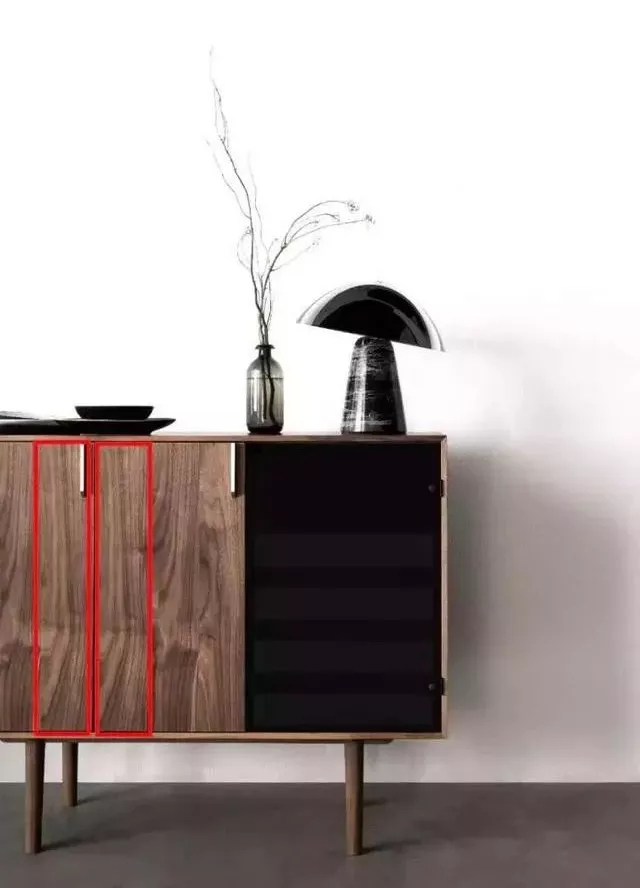 一是看纹路,正常生长的树木裁成同样大小的木板,极少有可能会出现花纹一模一样的,即使是同一块板子从中劈开,也应该是轴对称的花纹,比如下图的柜子,柜门上出现相邻的一模一样的花纹,那就是贴皮无疑了。