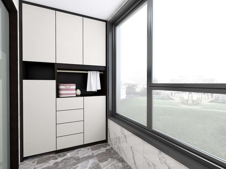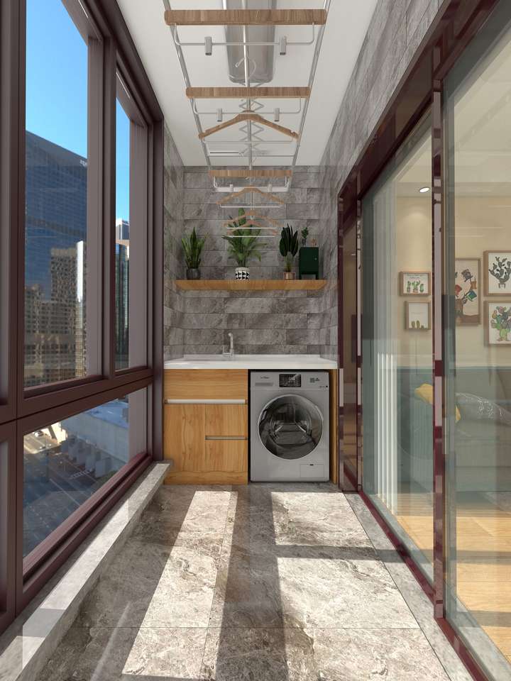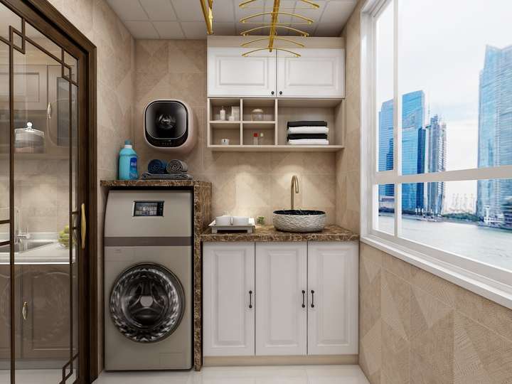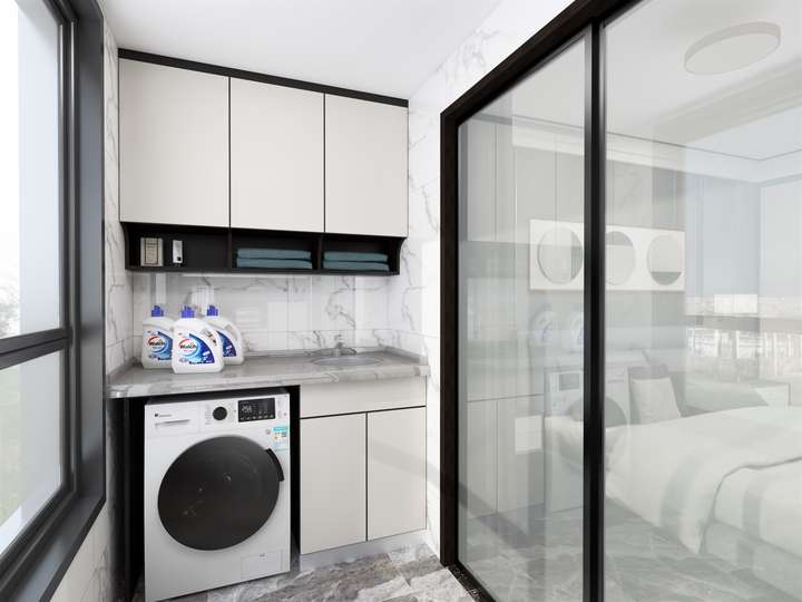 采用嵌入式设计,规划专门的洗衣区,能防尘防潮,减少洗衣机噪音,同时增加阳台置物空间。规整洗衣液等家居用品存放,杂物有藏有露,收纳井然有序。