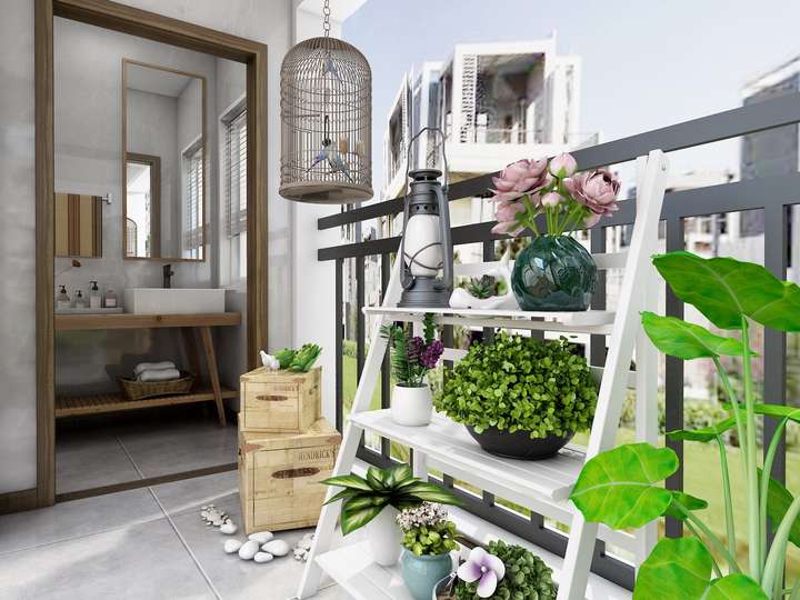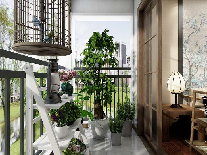 对于小阳台,可充分利用垂直空间,利用多层的落地置物架等,将盆栽悬挂在阳台栏杆上。如花架与置物架架组合收纳,缤纷的花盆错落摆放,空间层次感就很强。绿意环绕,让阳台成为一个绿色自然的有氧空间。