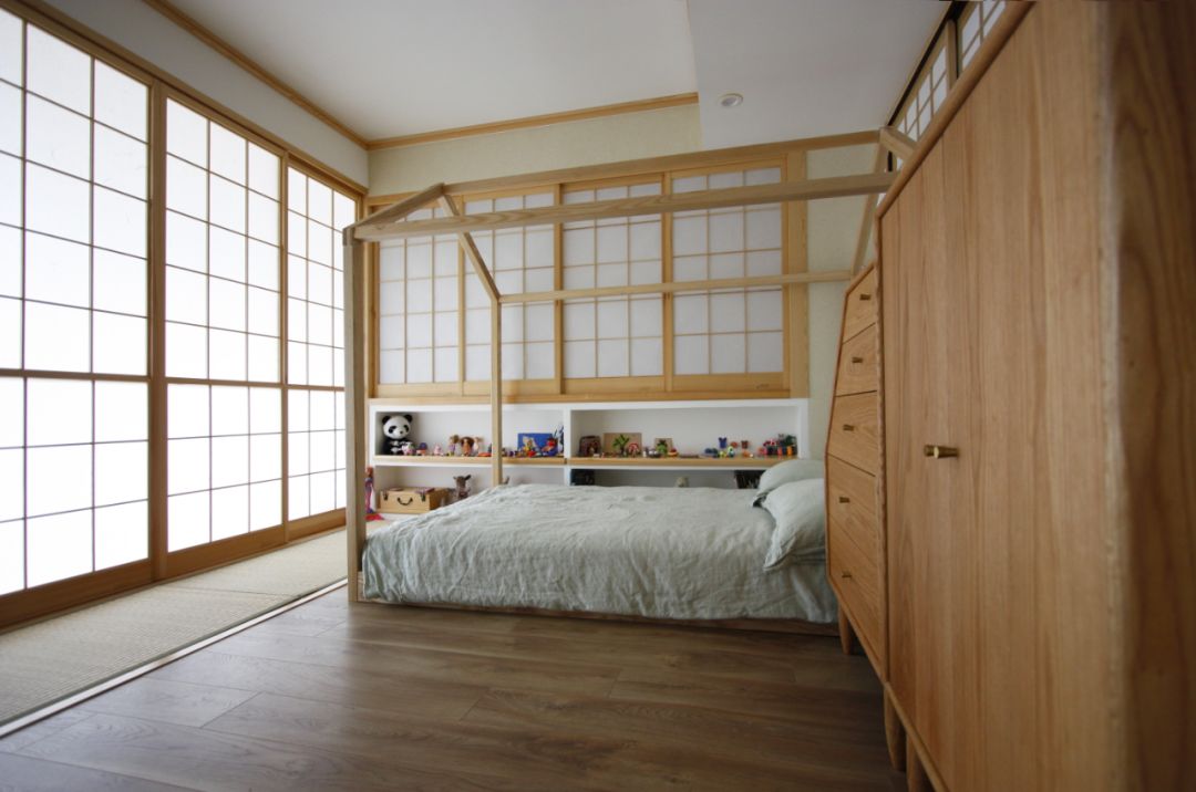 原木的色调,落地门,大落地窗,外面一片葱茏的阴凉。这个女主人专门为女儿设计的儿童成长室。