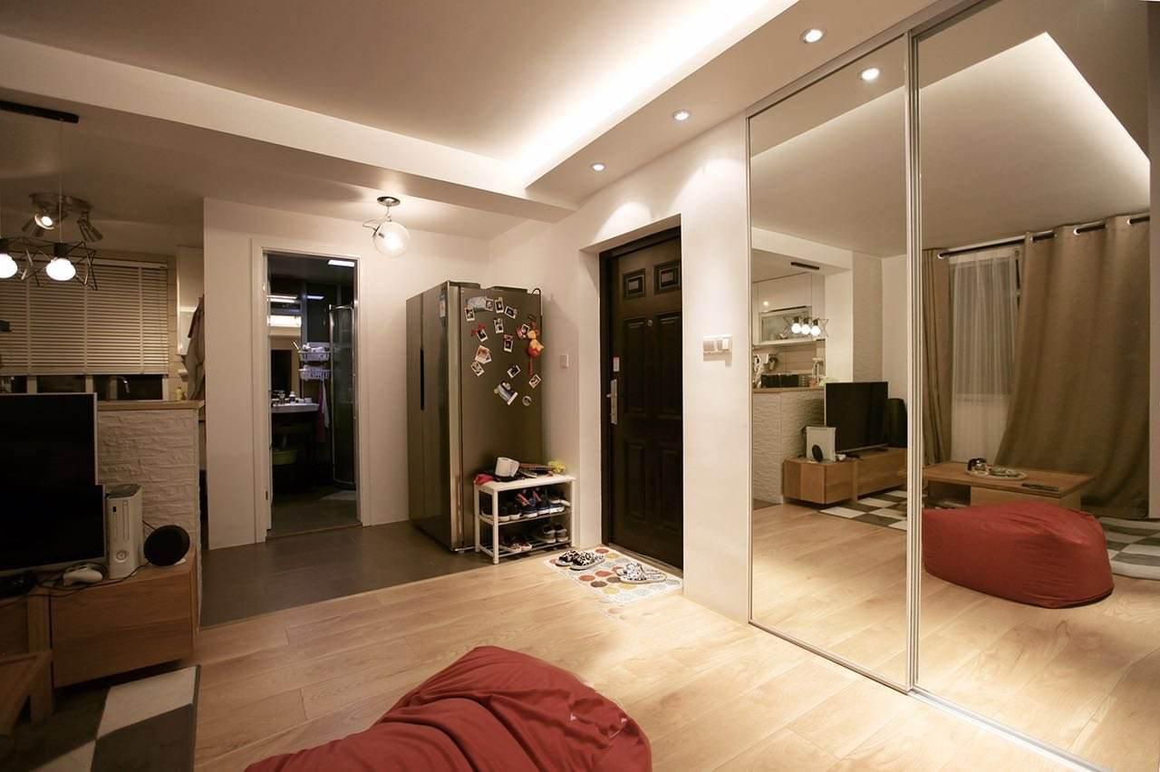 小户型空间,善于利用墙面进行整体收纳,如上图,满墙收纳柜浅色设计,成就鞋柜衣柜以及书桌空间