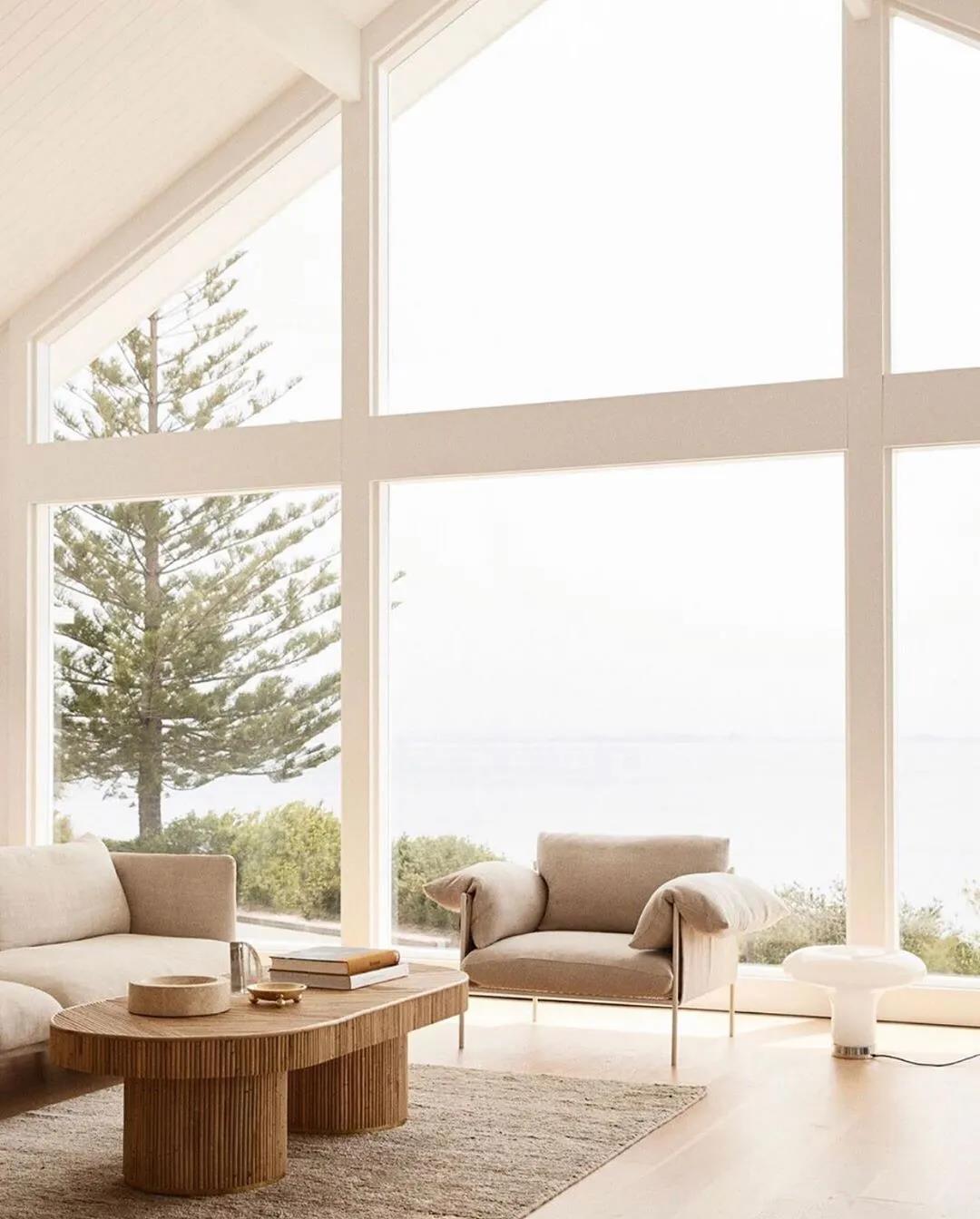 燕麦色布艺沙发搭配简约的实木茶几,清新自然,木材丰富的肌理和圆润的边角带来舒适温润的温馨感受。客厅面朝大海的墙改成一整面落地窗,纯白色粗框将落地窗分割成规整的几何形状,树影及大海的景致毫不吝啬地收入室内,只觉得视野辽远、心胸开阔。