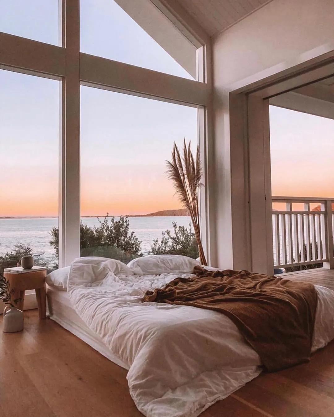 客厅与阳台之间的区域还加了一张大床,纯白色床品搭配原木床头柜和几枝芦苇的点缀,天气好的时候方便观赏日出日落,闲适自在。