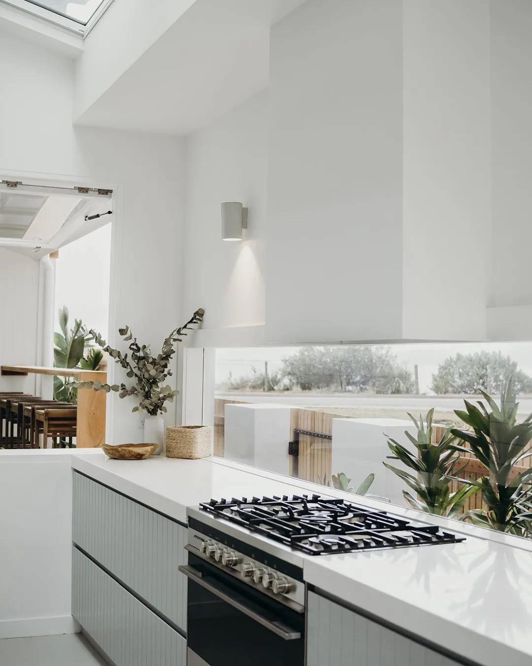 U型厨房和中岛设计使区域空间足够宽敞、收纳功能足够强大。简约的白色橱柜符合整体空间纯净、整洁的风格,厨房中部的岛台既可以释放橱柜台面空间,又能够当做小餐台使用。