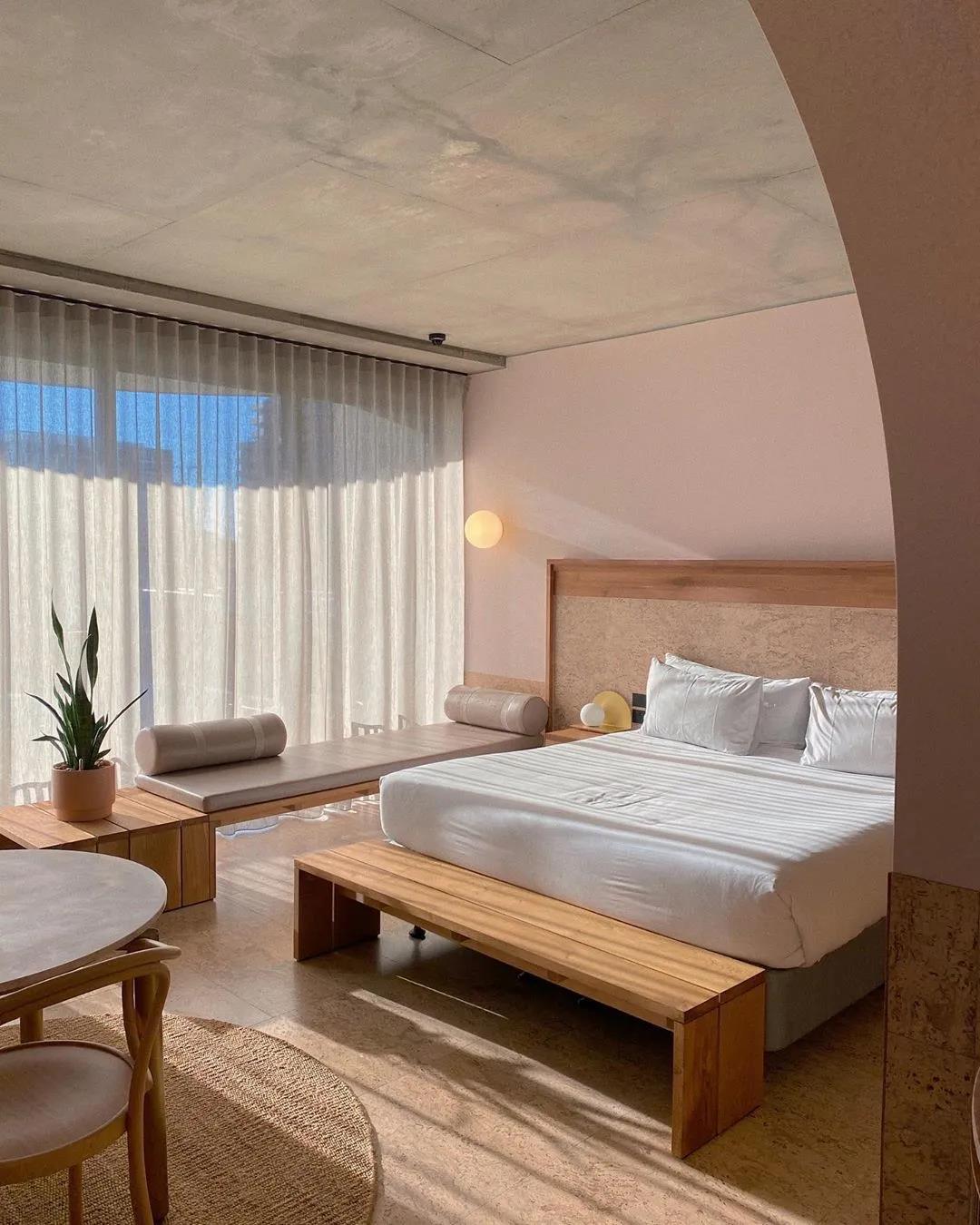 卧室独特的拱门设计带有浓浓的地中海风情,抓人眼球。窗边的木质飘窗铺上厚厚的浅灰色垫子和枕头,阳光透过白色纱帘洒入屋内,营造出舒适浪漫的起居氛围。床头板、床头柜、床尾凳以及卧室的桌椅都是实木风格,延续了客厅的搭配。