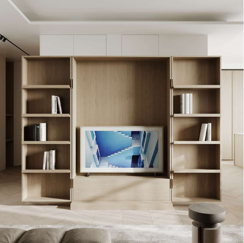 咖啡色沙发与原木色配色,传递出一种高级感和屋主的格调品味。简易的展示架形成沙发的背景,放阅读的书籍,装饰艺术品等,美观又实用。