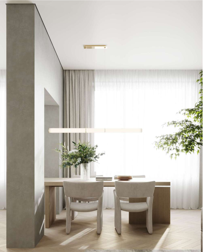 餐厅灰色布艺椅与原木长方形餐桌搭配,简易的圆形筒灯给予餐桌绿植足够的光线,窗帘运用白纱与灰色,大面积的光进入室内,营造出隐约柔和的朦胧美。