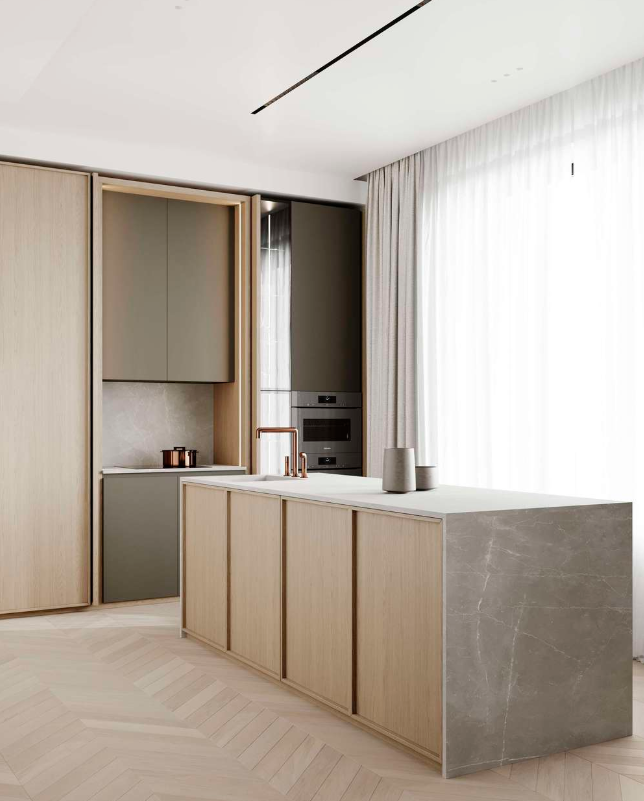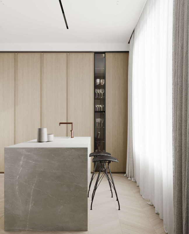 厨房中央岛台,运用灰色大理石纹理形成水池,玫瑰金龙头增加了质感。靠墙的位置做成整柜,原木橱窗采用玻璃放置杯子等,而高脚椅、烤箱系统以及烹饪台都打造黑色,充满时尚感。
