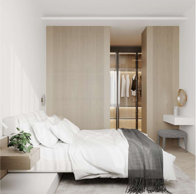 主卧以纯白为主色调,墙面不加以装饰,打造一个干净清爽的起居环境。卧室配有衣帽间,做成木栅栏的表面,原木打造的橱柜,运用黑框和灯光玻璃,有种商店橱窗的既视感。