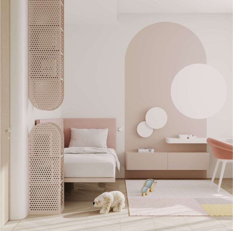 儿童房选择粉嫩的色调与原木材质结合,营造温馨舒适的氛围。粉红色衣橱门板手组成圆形,橱柜下放收纳箱,两面蜂窝式的储物架含书架分隔系列和常备衣物的穿搭悬挂。床头储物柜也设计为粉色,多个白色圆点缀墙面,优雅中暗藏萌态。