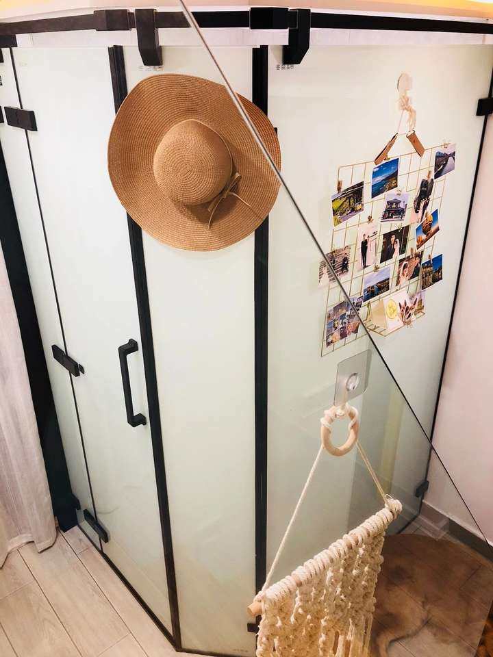 觉得家里只有一个卫生间不够用,于是书房里用钢化玻璃定制了一个小卫生间,平时也是霈梵的化妆间。