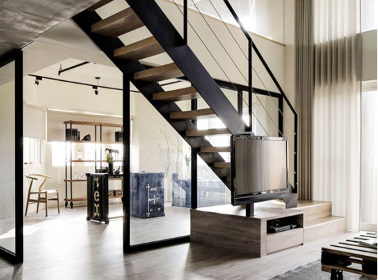 在工业风的跃层装修设计中,可想而知,见到最多的定然是黝黑是金属材质。地面选用浅灰色,黑白灰经典三剑客,让居室更显干脆利落。