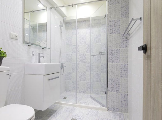 卧室之中带着一个超级宽敞的卫浴间,不同于跃层装修设计中其他空间那样的黑白配,而是选择了细小的浅紫色马赛克,搭配纯净白,做出若隐若现的迷人效果。