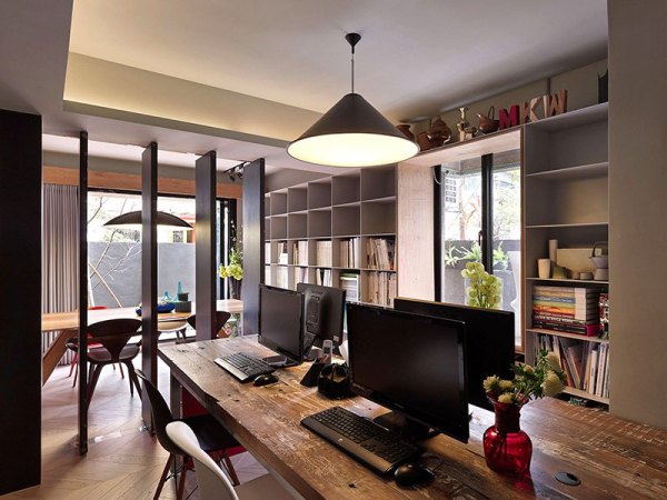 2、美式办公室,装修材料的选择上,美式风格喜欢用自然材质和颜色作为背景,衬托出舒适感富有生活气息的氛围,对于墙面或顶面的处理上,常见的就是石膏线、木线条等作为主要装修元素来体现。