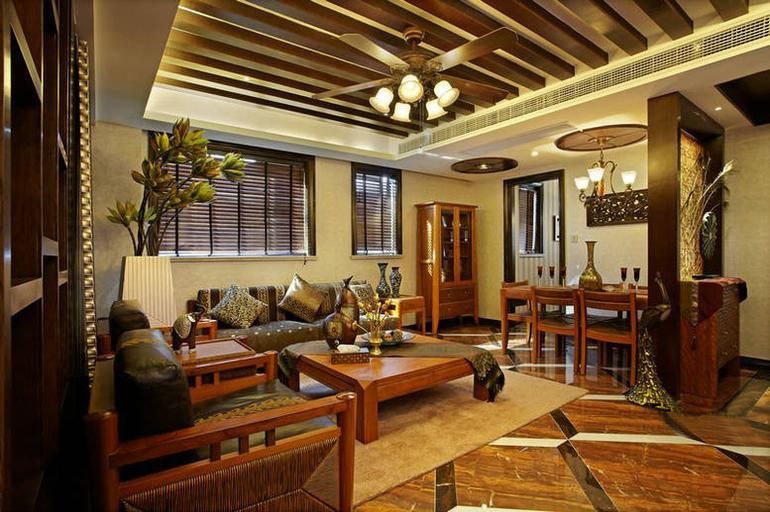 4、取材上以实木为主,主要以褐色以及深褐色柚木为主,搭配藤制家具以及布衣装饰,常用的饰品及特点有泰国抱枕、砂岩、黄铜、青铜、木梁以及窗落等;