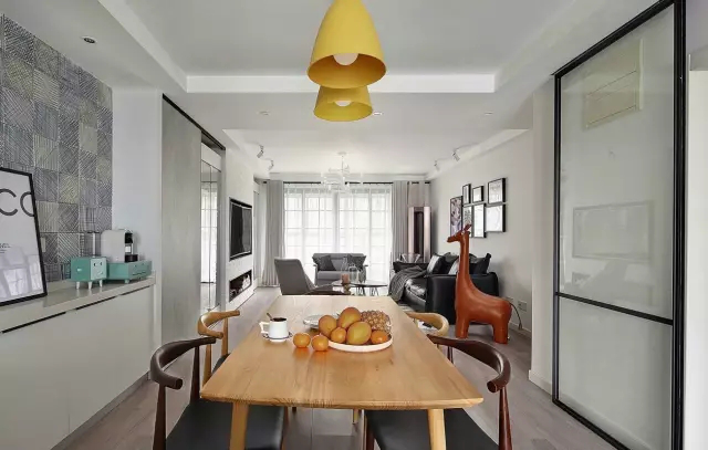 餐厅色彩逐渐明亮起来,亮黄色的吊灯,暖木色餐桌,更有家的温馨感。
