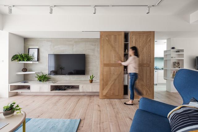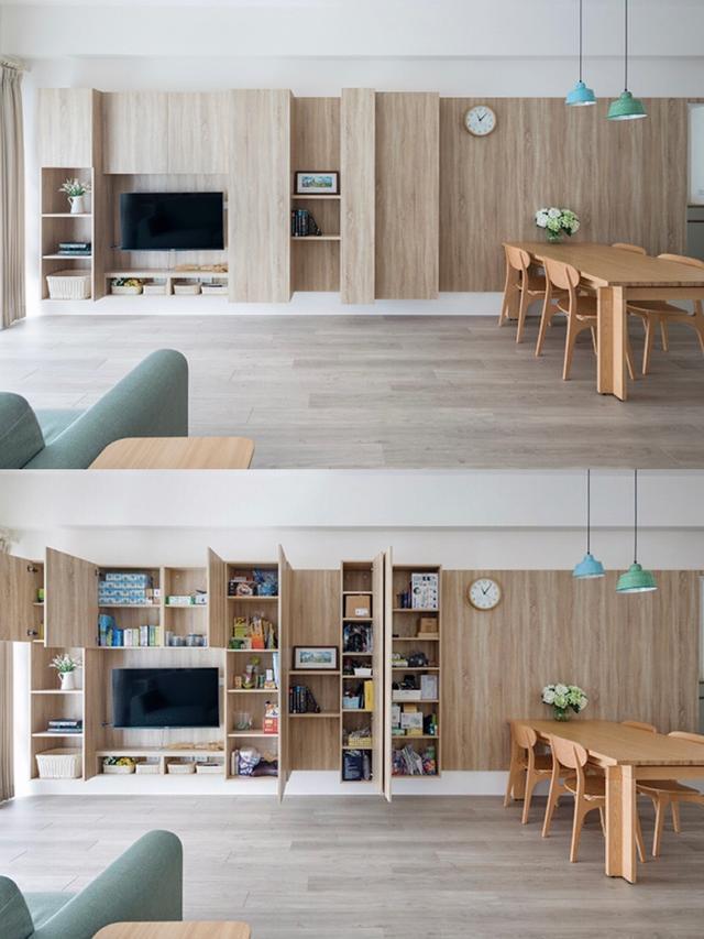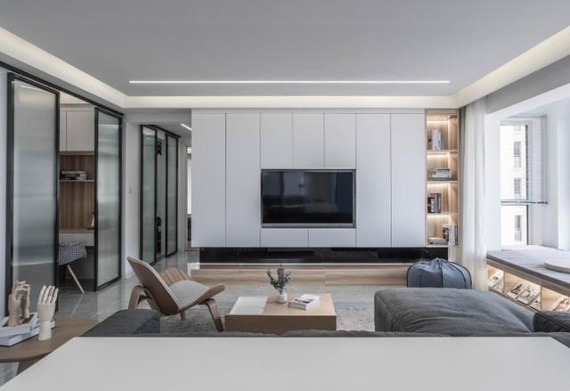 一整面墙的电视柜设计建议参考二八定律,20%的空间是无门板的,80%的空间是有门板的,这样设计的出来的柜子好看,同时也非常实用!