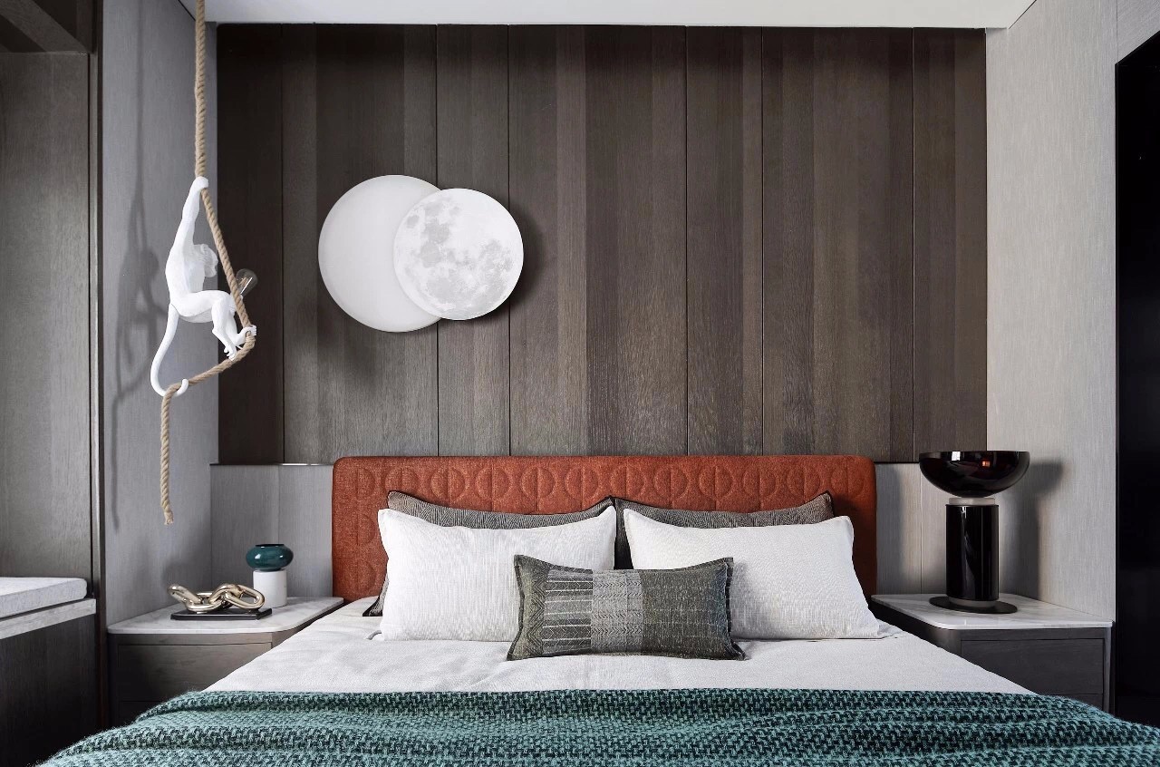 软装搭配的时候,灯光很重要,比如床头的位置,可以挂一盏有个性的灯,非常吸睛。