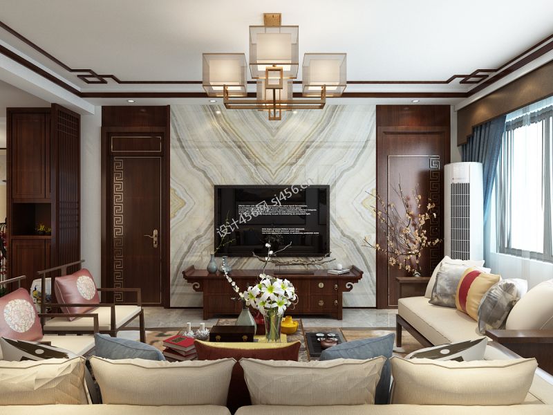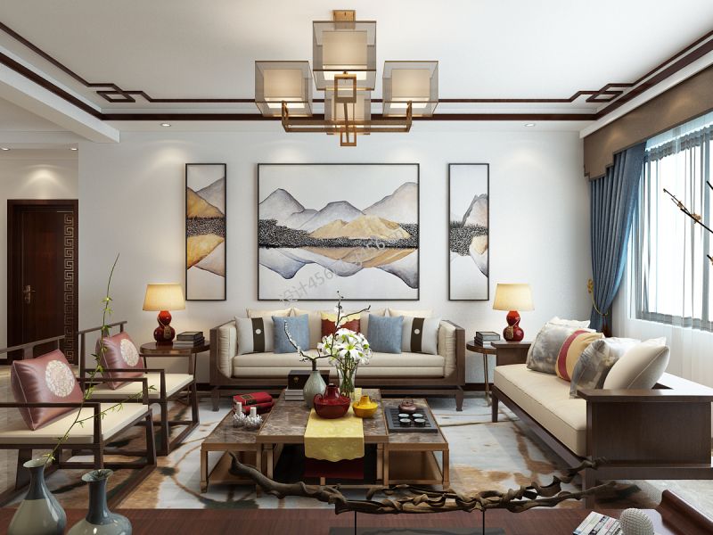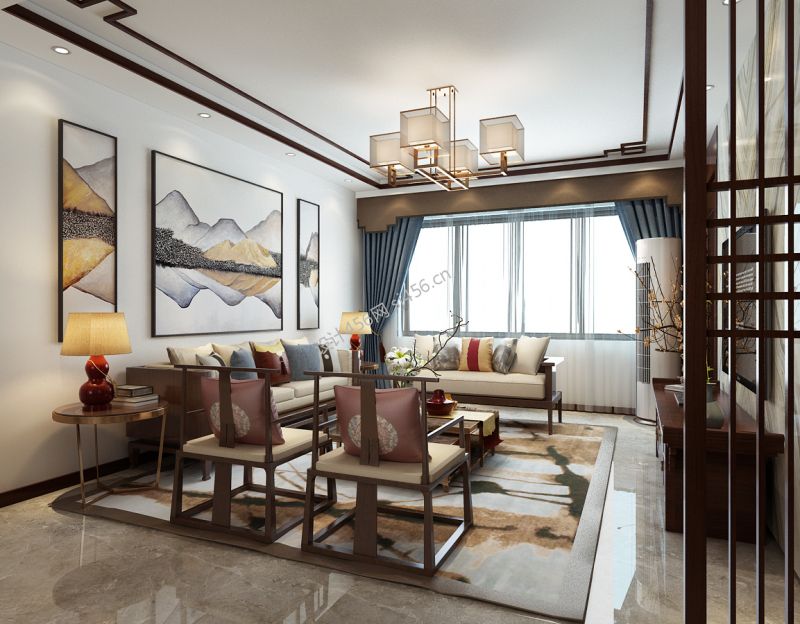 蓝色康桥116平米三居中式客厅吊灯装修设计效果图欣赏