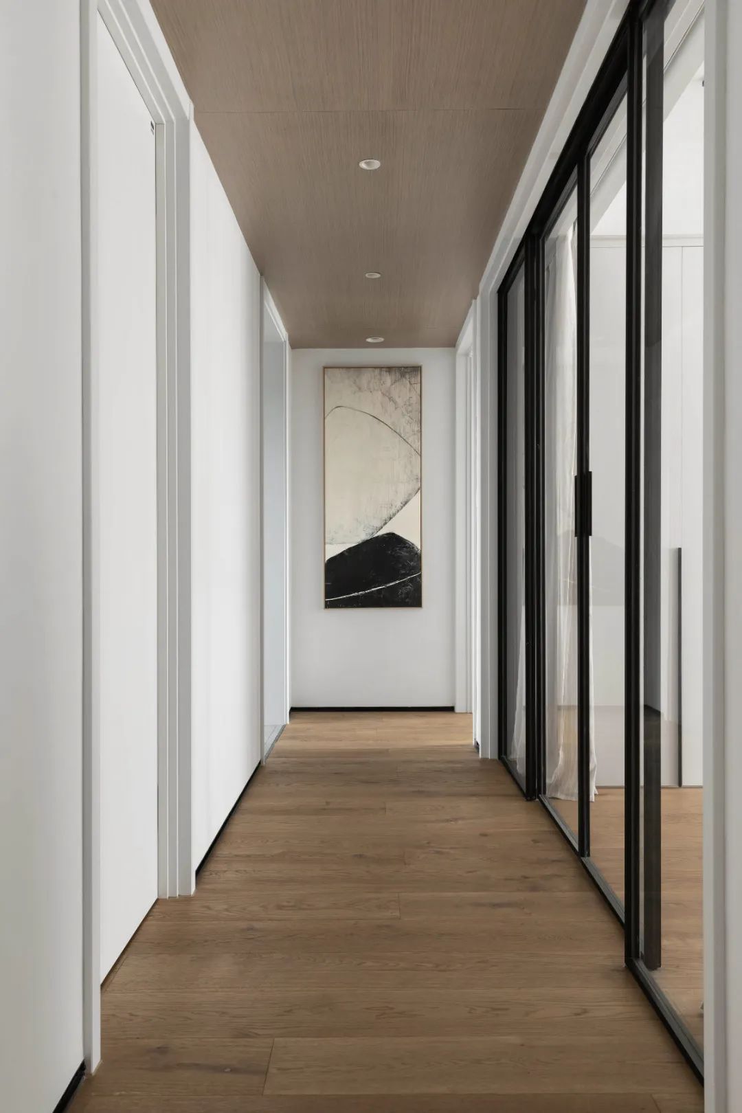 ▲走廊墙面挂一幅极简黑白调的装饰画,侧边以落地玻璃推门设计,让空间显得更加的现代舒适。