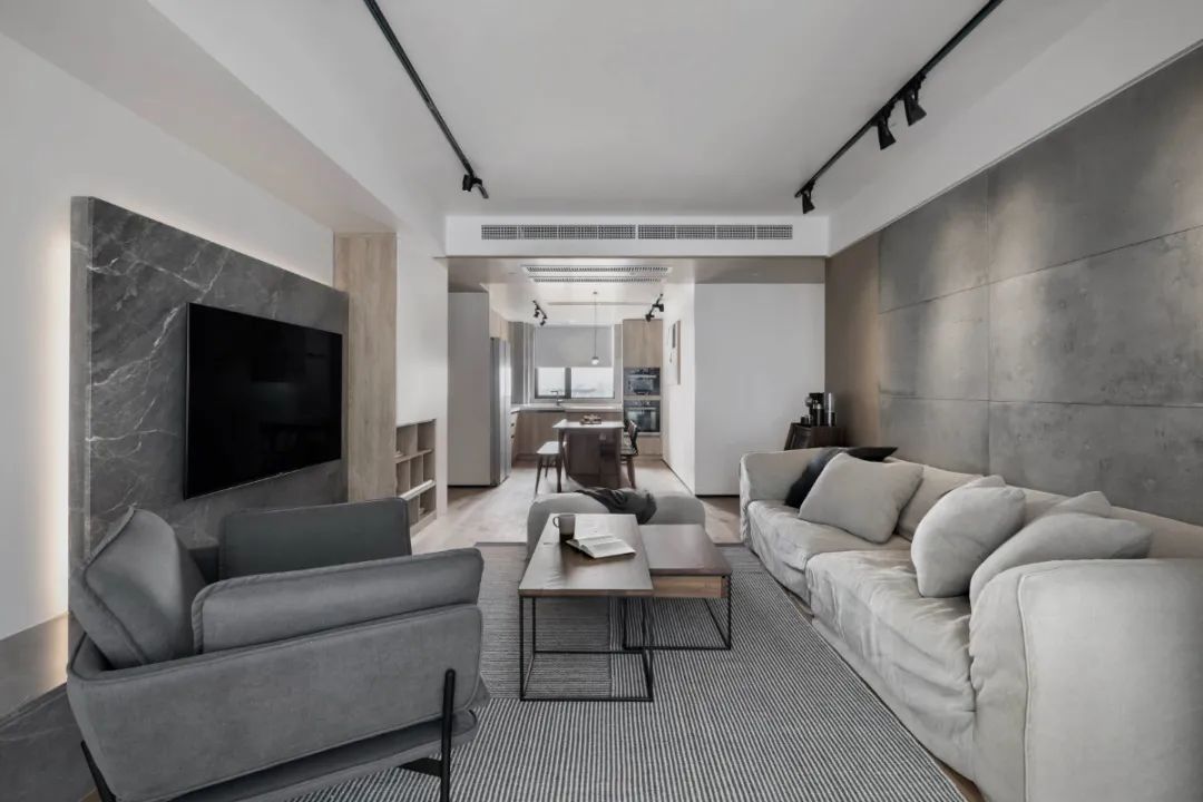▲客厅整体以简约灰色的空间,岩石板沙发墙,大理石造型的电视墙,结合天花无主灯的设计装上导轨灯的设计,显得更加高级档次。