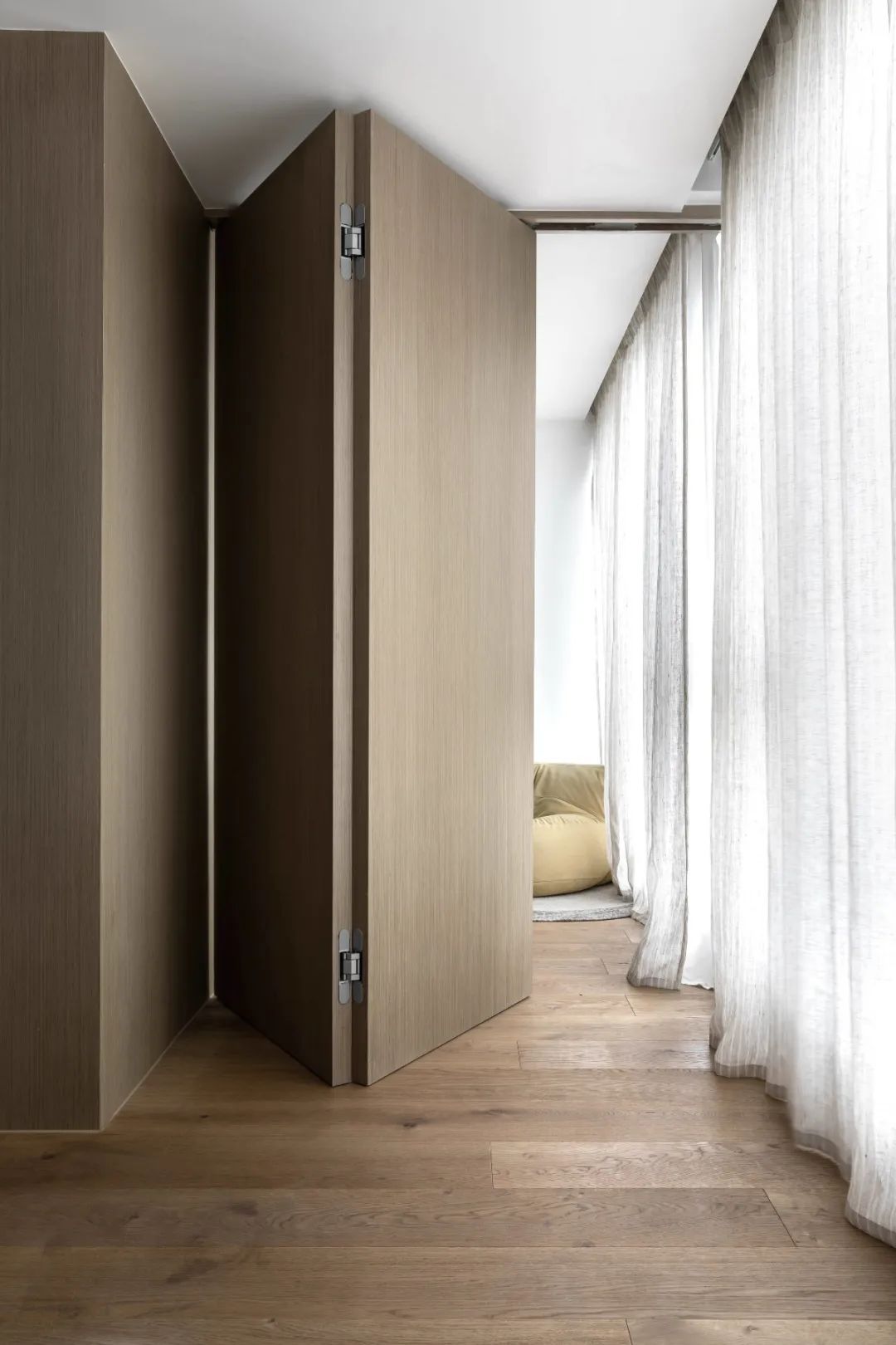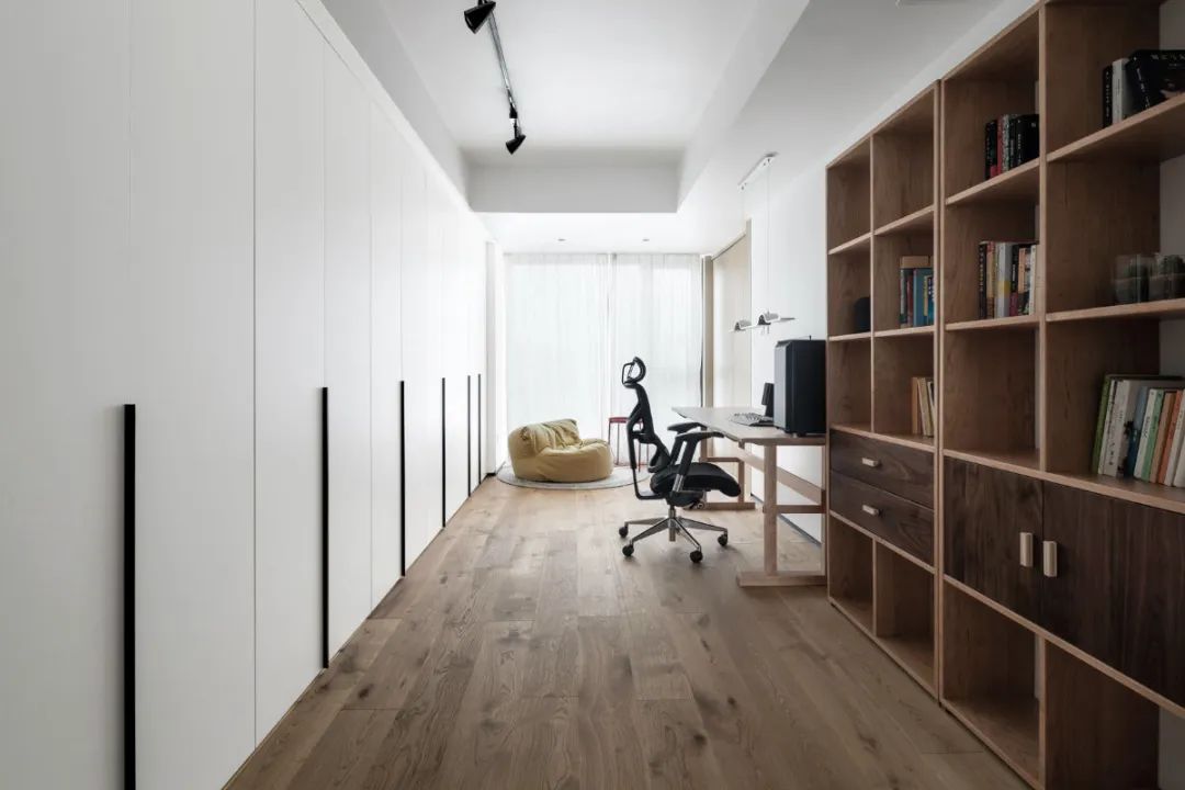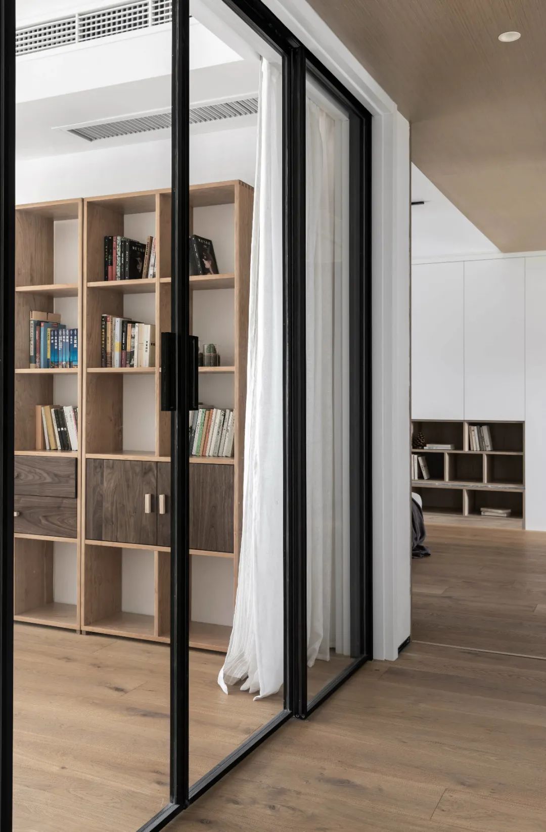 ▲书房与走廊之间是玻璃的落地推拉门+窗帘设计,让书房空间的采光进入到室内其他空间,同时也让书房空间更加灵活舒适。