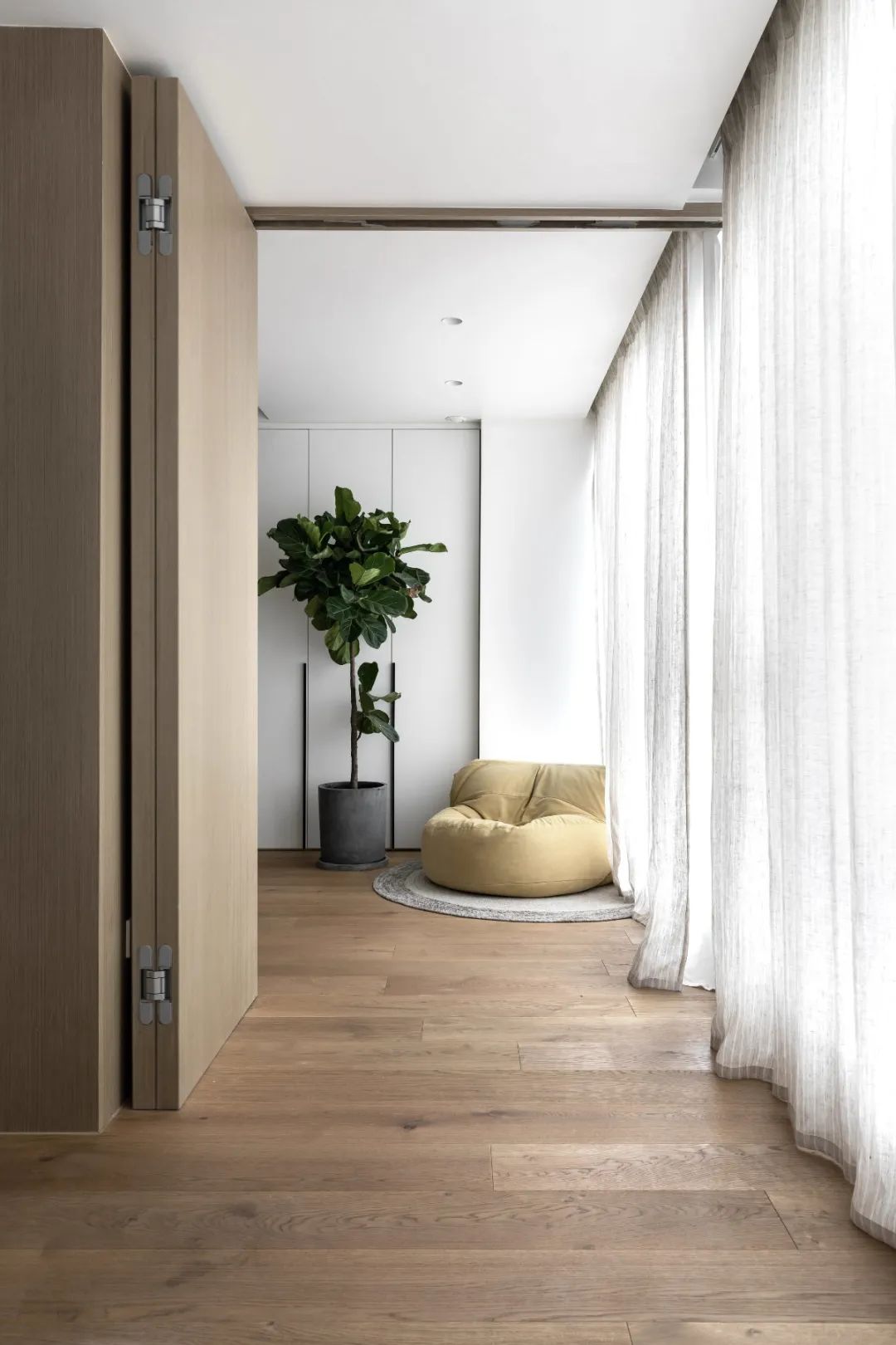 ▲打开后与书房相通,懒人布艺椅子与绿植装饰,带来的是清新舒适的惬意感。