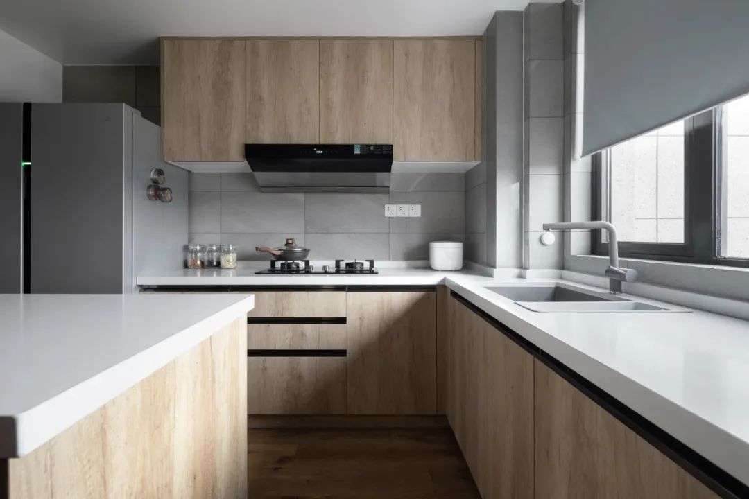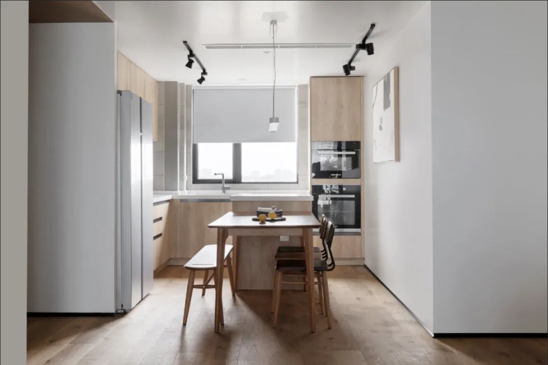 ▲浅木色的橱柜布置,在明亮的采光下,让餐厨生活显得轻松而自然。餐桌挨着的中岛台,也为开放式的餐厨空间带来了轻松舒适的体验。