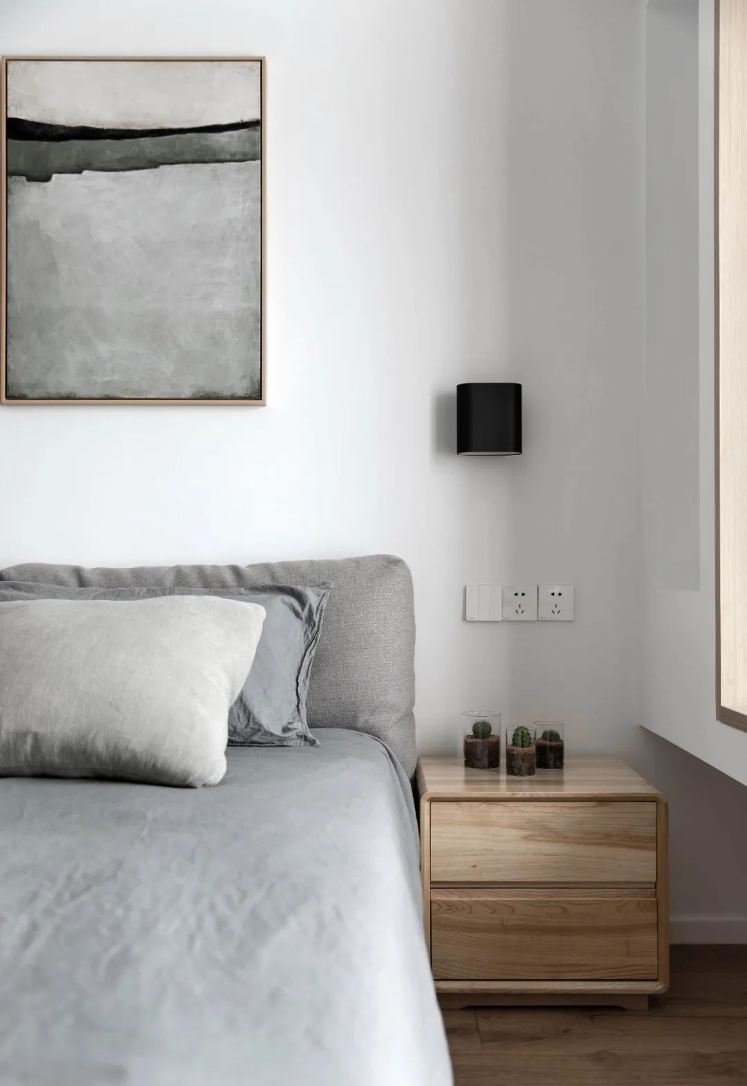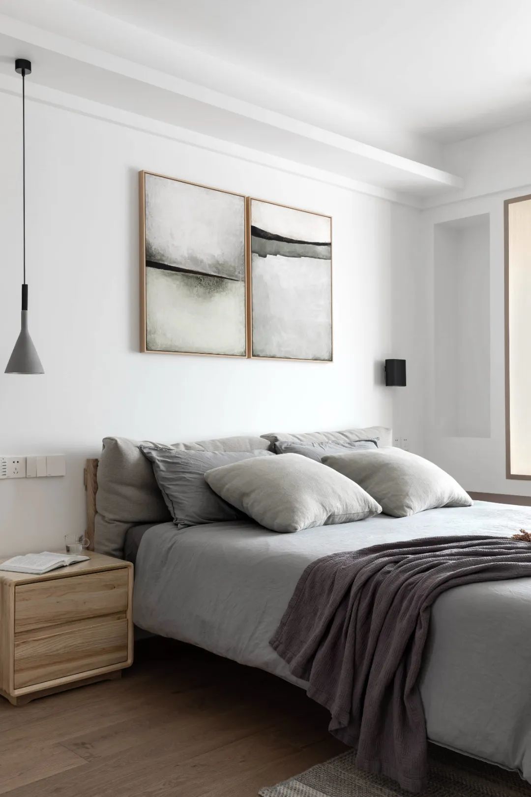 ▲主人房整体空间都比较简洁舒适,床头墙上挂了两幅灰调的装饰画,搭配灰色地毯与床单布置,与木质感相呼应,带来的是一种简约舒适的大气感。