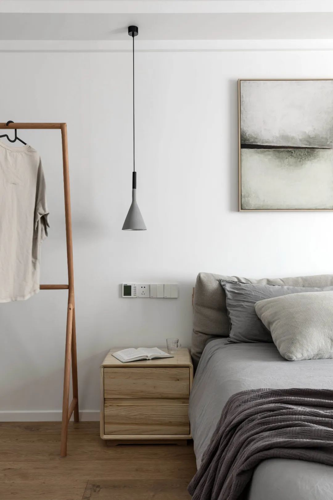 ▲床头柜旁边放置了一个成品木质挂衣架,临时换下的衣物都可以挂在这里方便再穿。