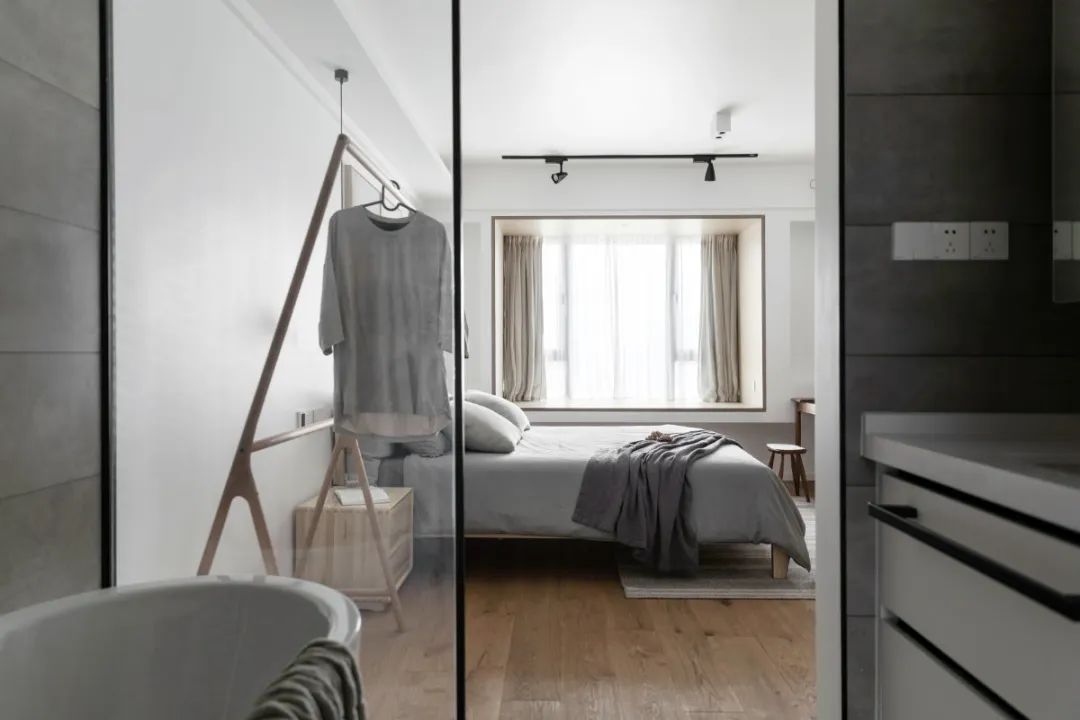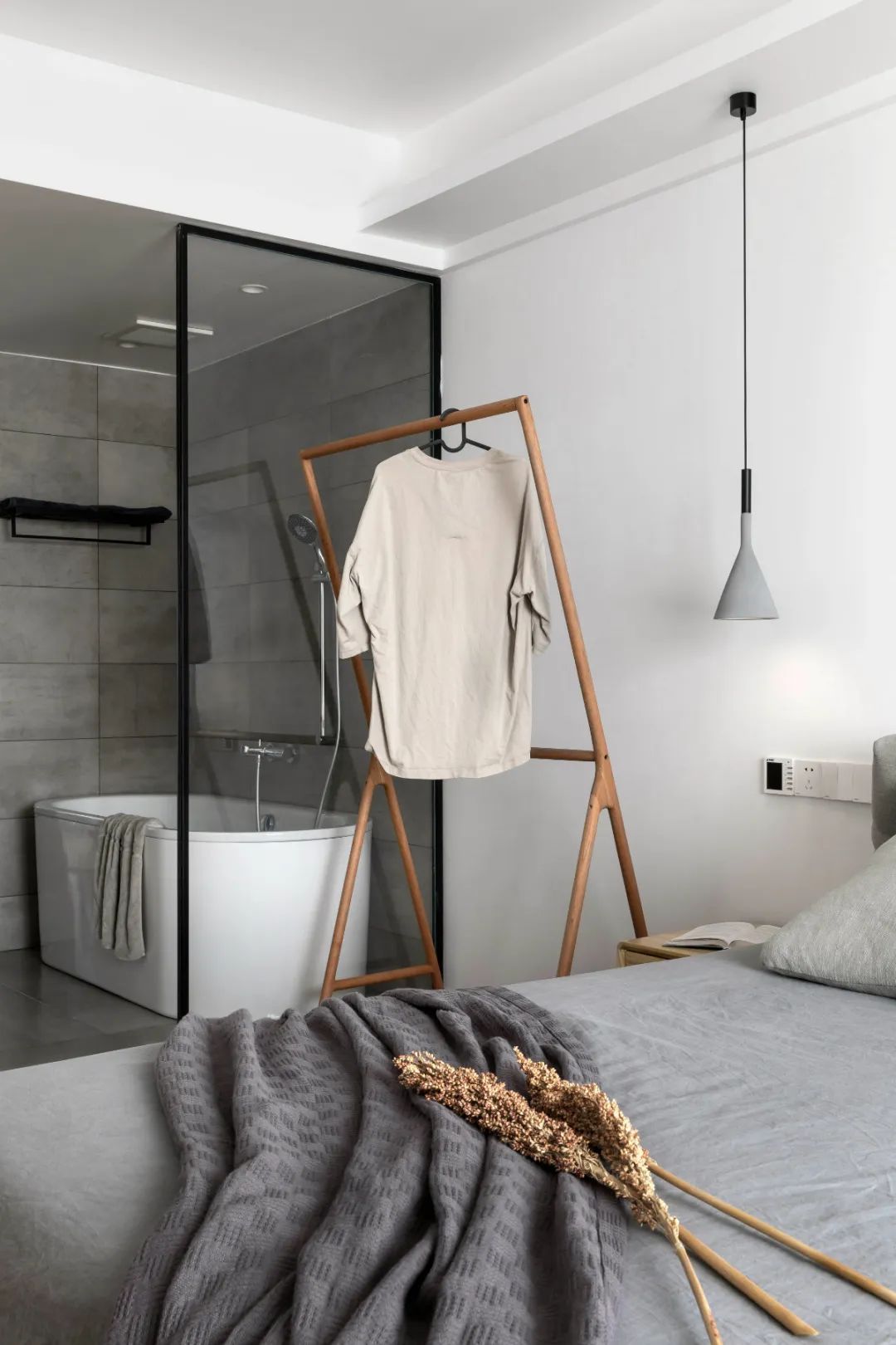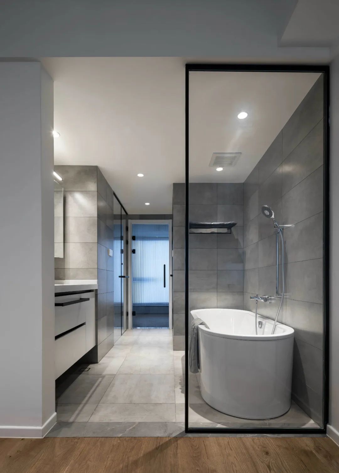 ▲卫生间整体浅灰色的空间,浴缸与洗手盆设在靠卧室区域,里面设计淋浴区与马桶区,最里侧的是衣帽间,整体空间利用合理舒适。