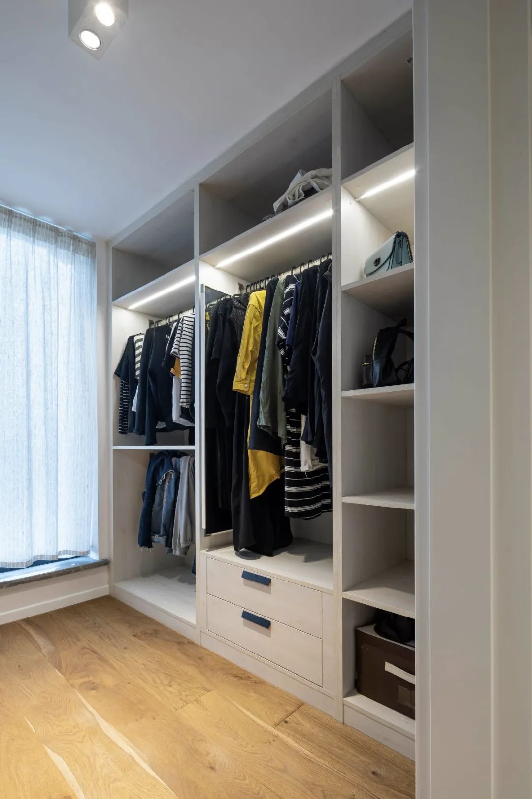 ▲衣帽间区域的柜体以开放式的格局设计,放衣物与取衣服都非常的方便。