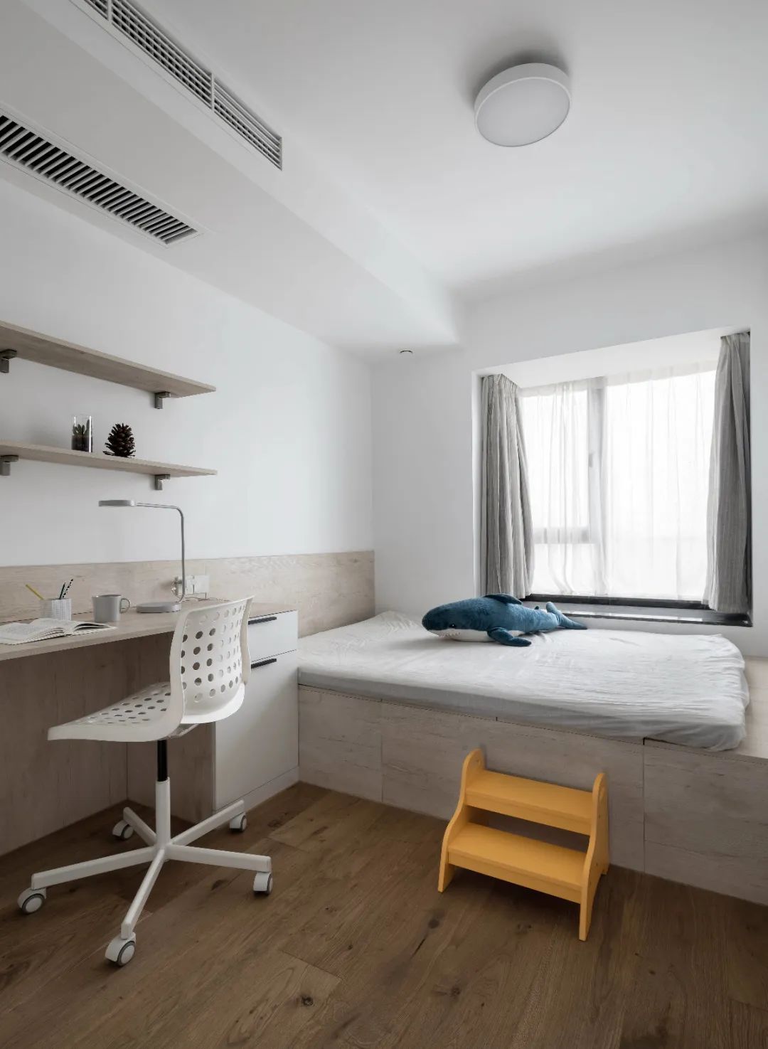 ▲儿童房以定制榻榻米床+书桌床头柜设计,榻榻米较高加了一个小踏步梯让孩子上床更方便。