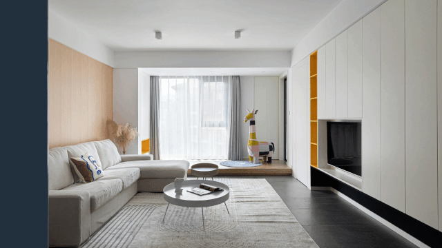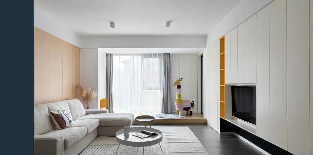 这是屋主夫妻购入的改善性住房,有了小孩之后,家里的东西越来越多,每个柜子都塞的满满当当;随着小孩一天天长大,又希望给他跑来跑去、自由玩耍的空间。所以,怎样让家「能装」又能「玩耍」,是这个家最主要的需求!