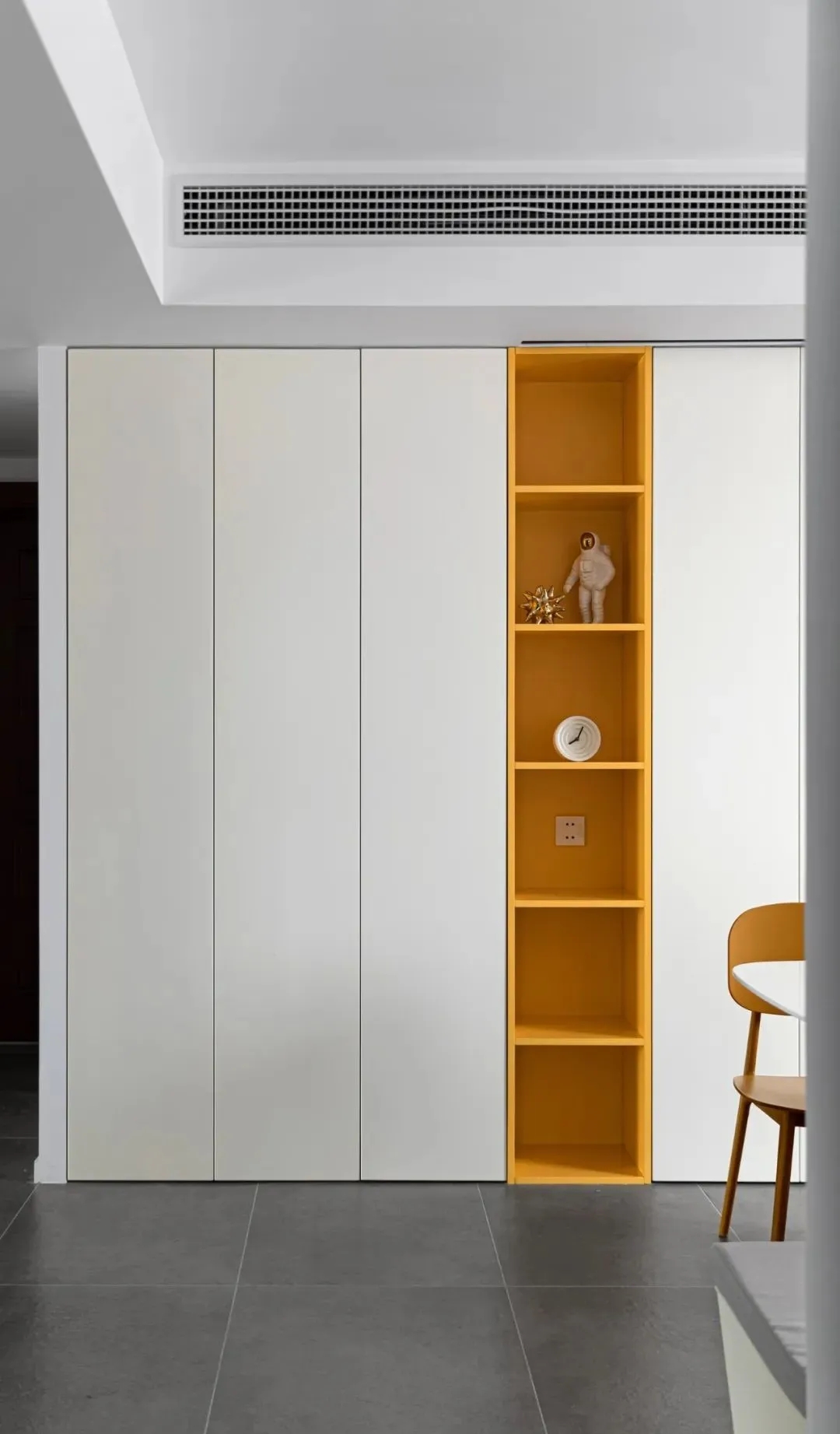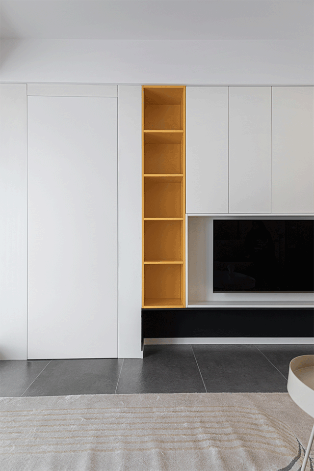 从玄关延续过来的定制柜,底下有一个悬的效果,看上去并不会太满。加上开放格的跳色,简洁之中透着活泼感。