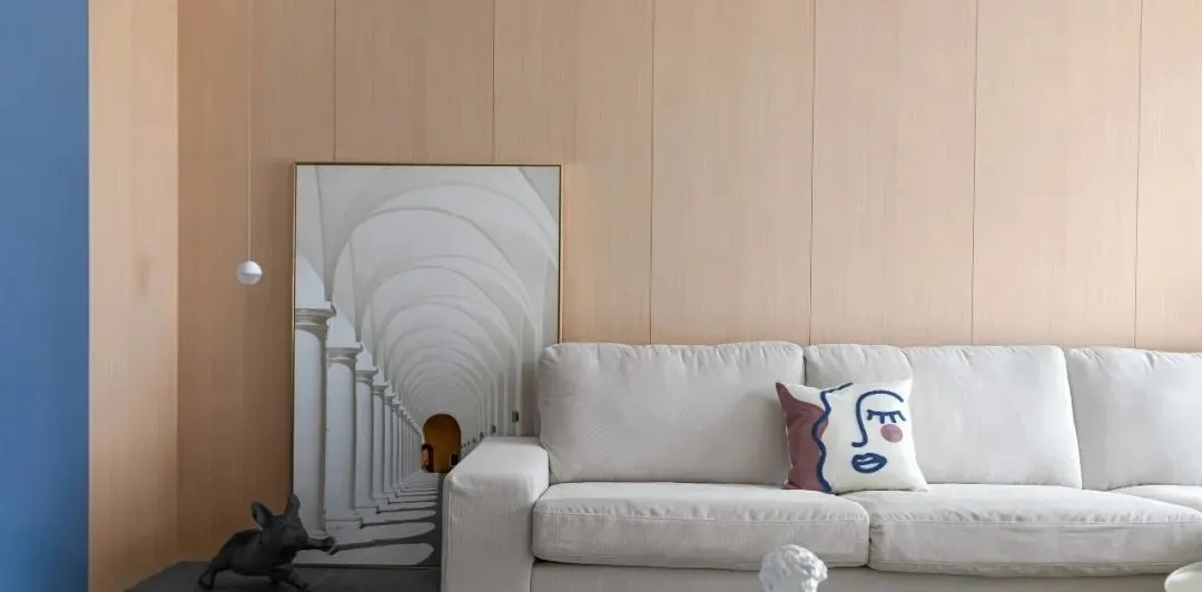以木饰面板做为沙发背景,简洁自然又温馨。而且材质也很适合有小孩的家庭,有涂涂画画的印记、也可以擦洗干净。
