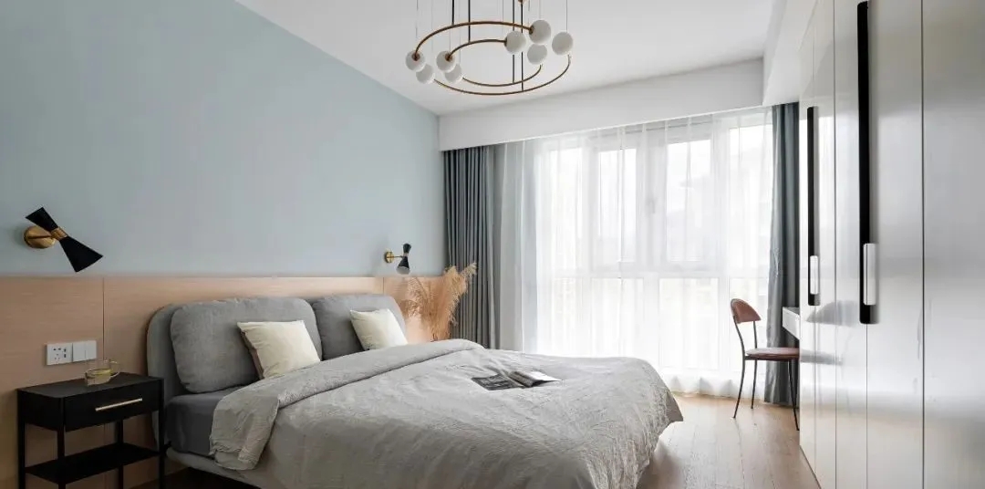 主卧背景墙选用带灰度的蓝色,淡雅清爽。现场制作木质背景墙,护墙又增添温馨舒适感。
