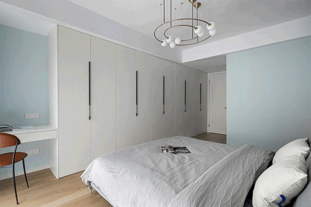 主卧打造了一整面衣柜,还在角落做了书桌兼梳妆台。柜子内部使用宜家艾格特储物系统,并选择折叠门,完全打开有步入衣帽间的即视感。