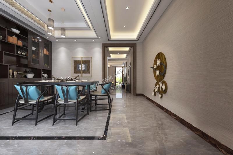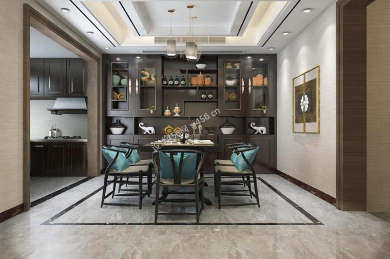 新中式风格别墅大餐厅酒柜装修设计效果图