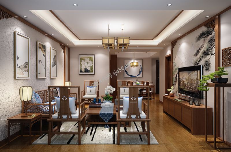 新中式风格120平米三居室客厅吊顶装修设计效果图