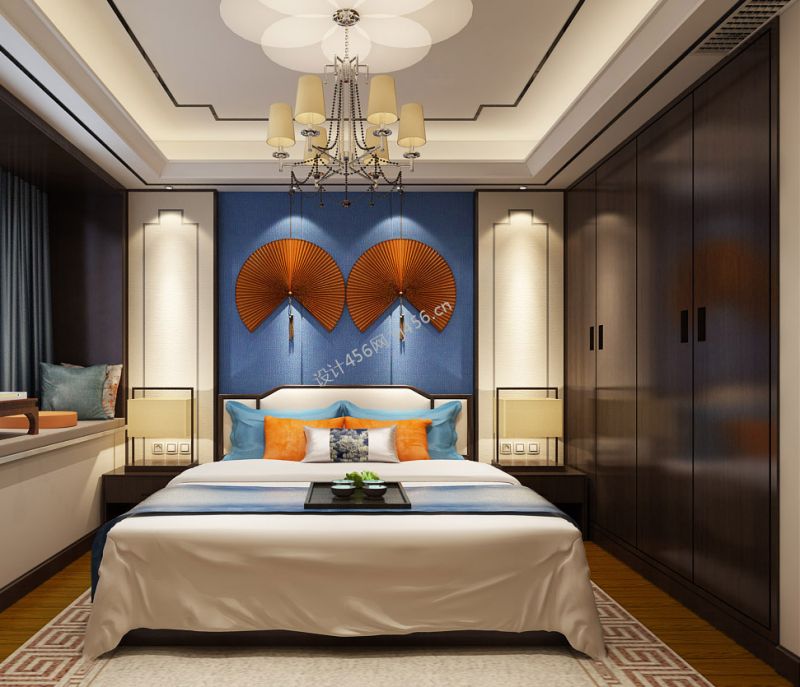 新中式风格120平米三居室卧室背景墙装修设计效果图