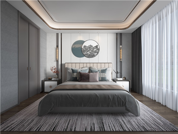 次卧中洋溢着一种不加雕饰的美感,纹理质朴、色泽素雅,每一处肌理都似乎在诉说着过往的故事与沧桑,带给我们可以触摸的温柔。中式元素在次卧空间中表达的比较明显,圆形手绘画让空间散发着中式典雅气息。