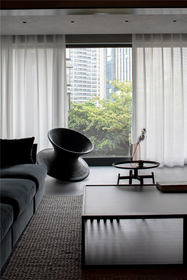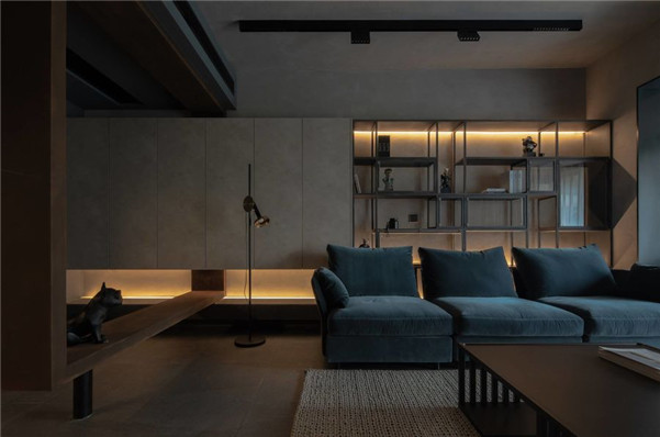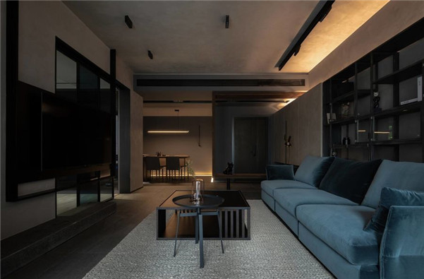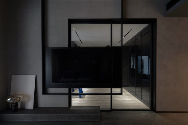 设计说明: 这是一个以单身自宅为主场的住宅项目,设计师改变了原有的空间结构,重构动线。 “开”与“合通透穿插,不对空间进行分割”。通过轻盈简洁的造型衔接空间视觉上的延伸,实现空间的灵活性与可观赏性。客厅、衣帽间和主卧的墙全部打通,无拘无束,弱化空间边界,用灰玻和隔扇门连接起来,房子看起来更有空间延伸,好似黑夜尽头。