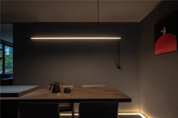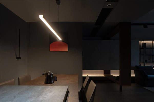 西厨与餐厅相结合,体现生活的品质感。餐厅比起客厅更有暗黑氛围,餐厅的墙面及顶面都刷成深色涂料,灯光氛围犹如咖啡厅一般,在餐厅是享受人间烟火的独特格调——餐桌台面使用铁锈色岩板,给人一种内敛又不张扬的感受。