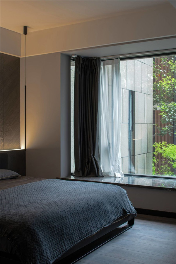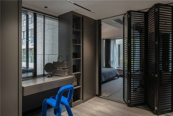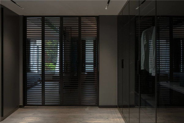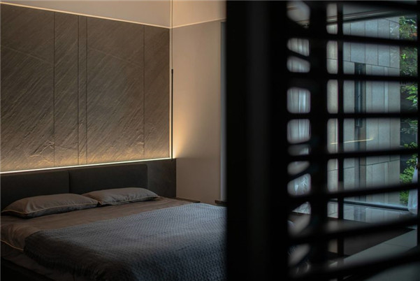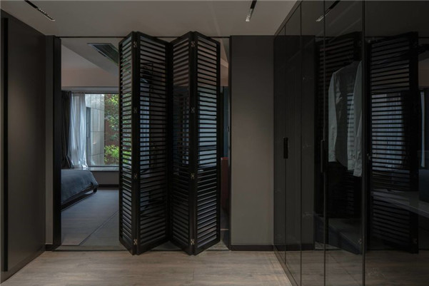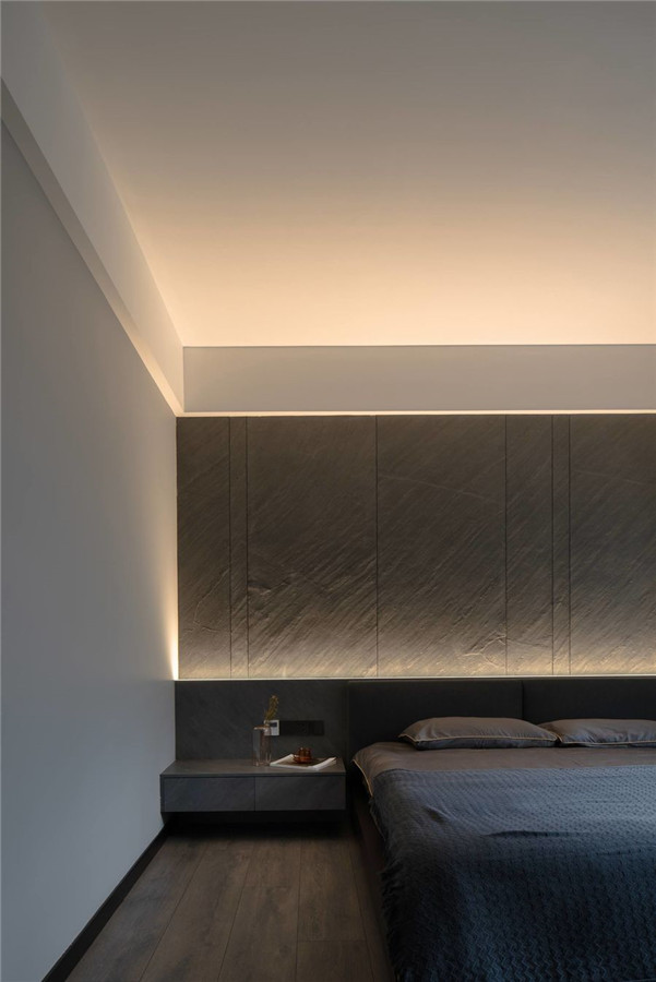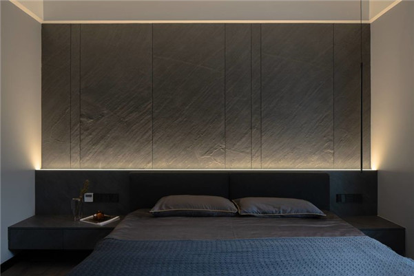 主卧延续了公共区域整体深灰的色调,材质使用上更精致沉稳,背景墙的深色超薄石材与空间整体搭配,凸显整体性与品质感。客厅,衣帽间和主卧的墙全部打通,无拘无束,弱化空间边界,用灰玻和隔扇门连接起来,房子看起来更有空间延伸,好似黑夜尽头。