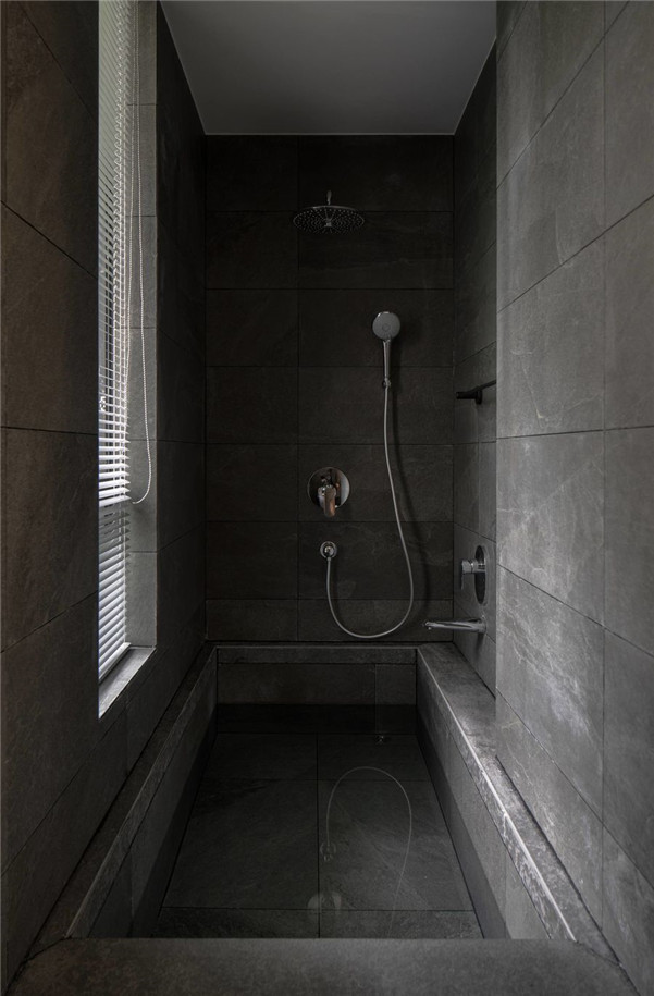整体灰暗色调的浴室,契合了整个空间的基调,从百叶透出的微光洒在石材上,凸显了浴室石材纹理的粗糙质感,赋予空间神秘氛围。