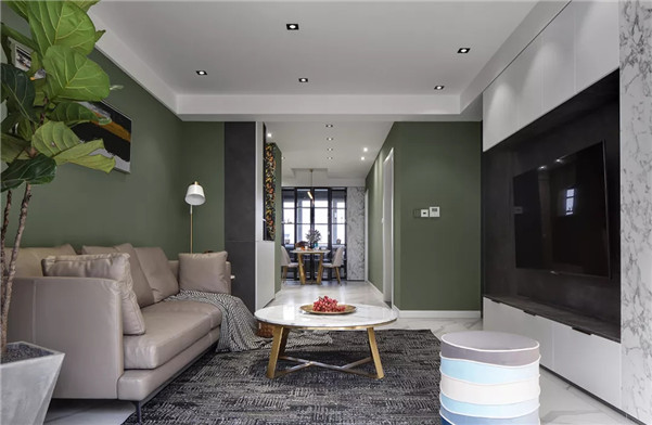 客厅沙发背景墙延续森林绿主题色系,而电视背景墙则选择了更具现代简约质感的灰白色系。