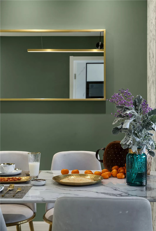 餐厅和客厅风格保持一致,精致简约,茶绿色餐厅背景墙上挂上一面金属边框横镜,更具意境。
